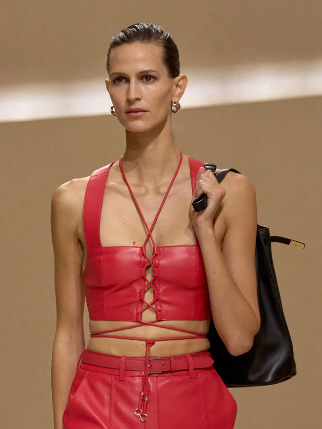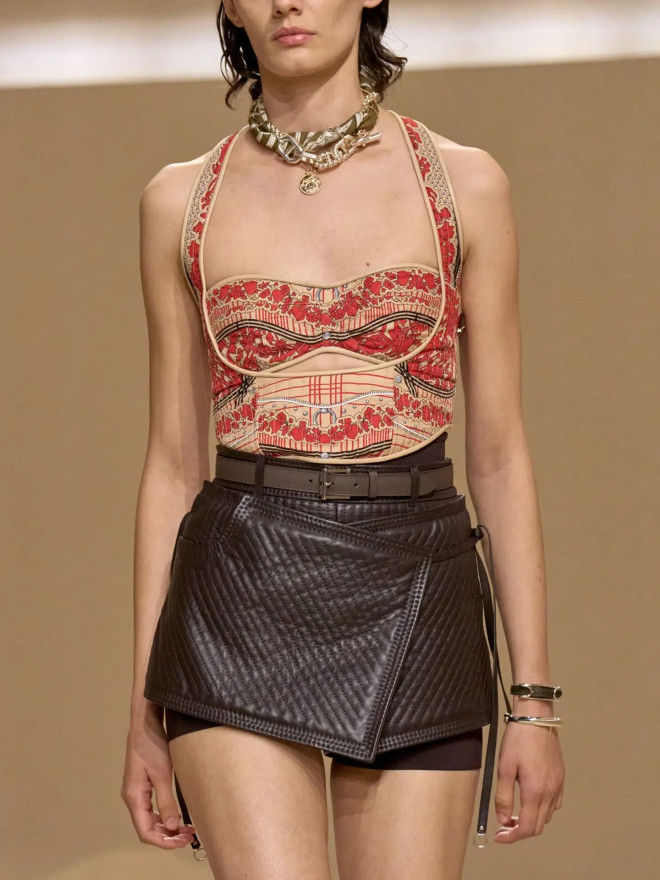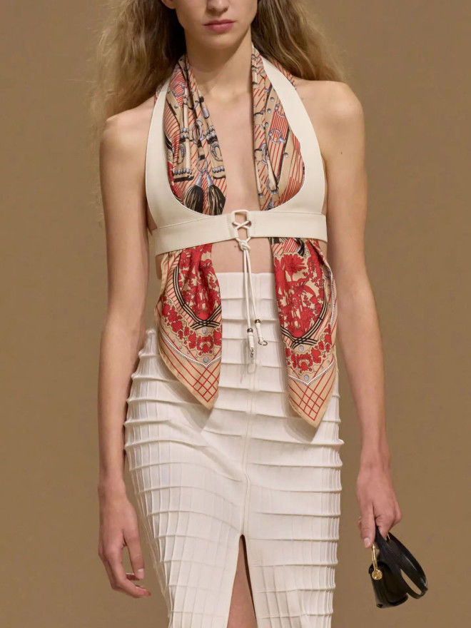 真丝方巾随性折叠为上衣,由皮革胸衣束裹,亦或化作雕塑感颈饰,与项链交织映衬。灵思巧构的组合式叠穿意在呈现而非掩映身姿之美。这种“一衣多穿”的理念,既响应了现代女性对实用性的需求,又通过材质与结构的组合,创造出无限可能的搭配方案。
