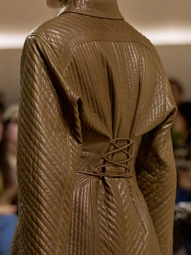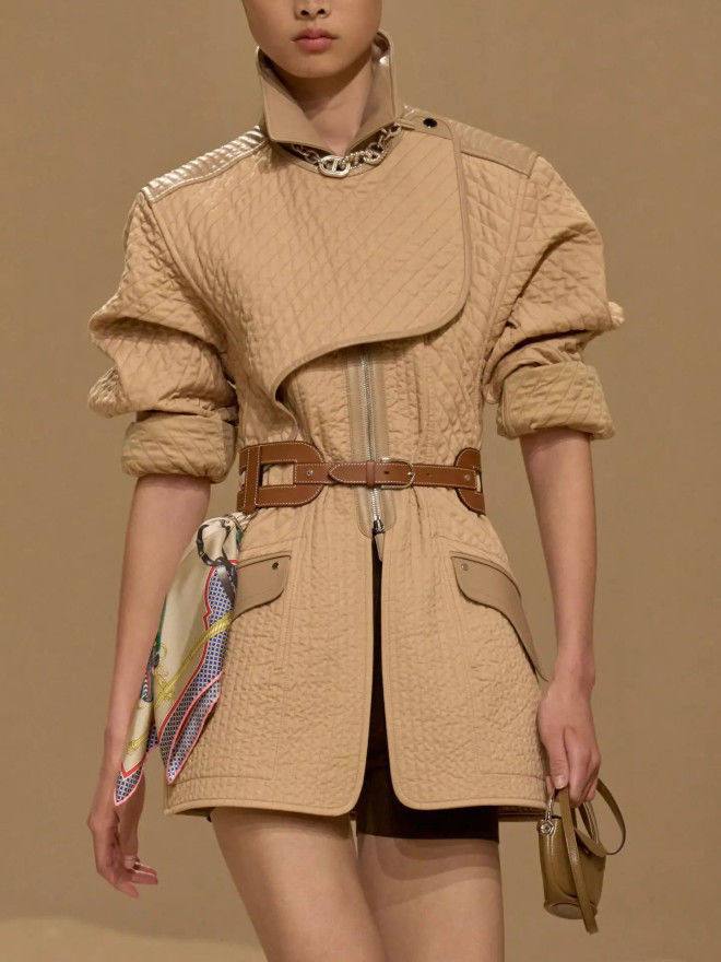 绗缝工艺的频繁运用,旨在致敬皮革工艺与悠久的布提刺绣。为活动自如而设计的短款骑士夹克,与绗缝亚麻帆布不对称半裙相映成趣;飘逸防风大衣灵感源于战壕风衣,以束带收紧腰身,呼应正装剪裁法则,亦诠释马术精准美学。