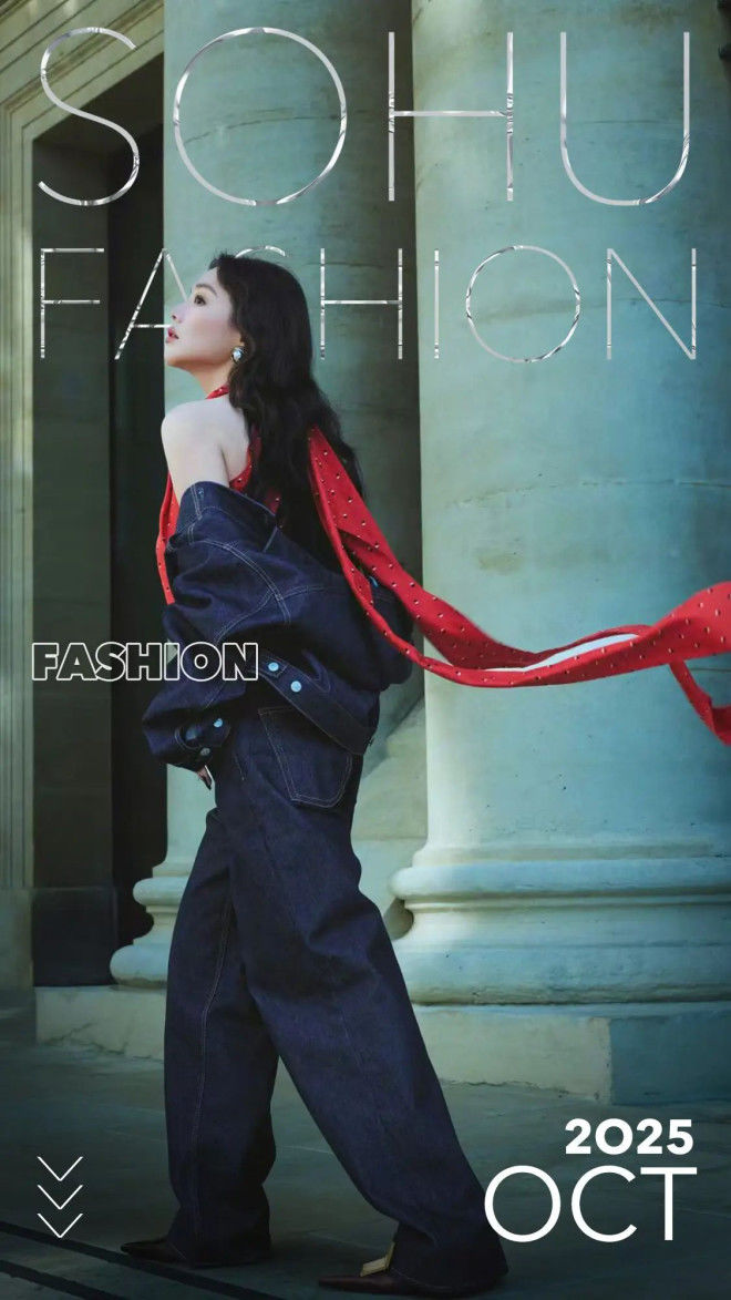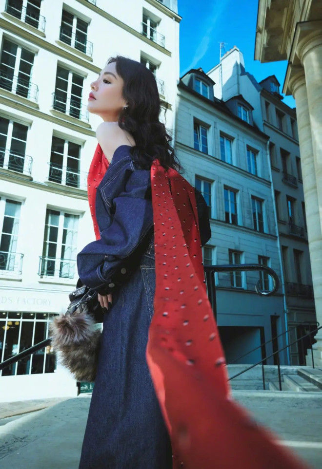 马思纯的看秀造型,选择了各种复古的元素,致敬秀场主题。原色牛仔、波点正红色内搭以及波浪长发,均有着怀旧经典气息。同时现代时装与众不同的轮廓和剪裁,则是与之协调平衡,堪称是看秀造型的典范之一了。