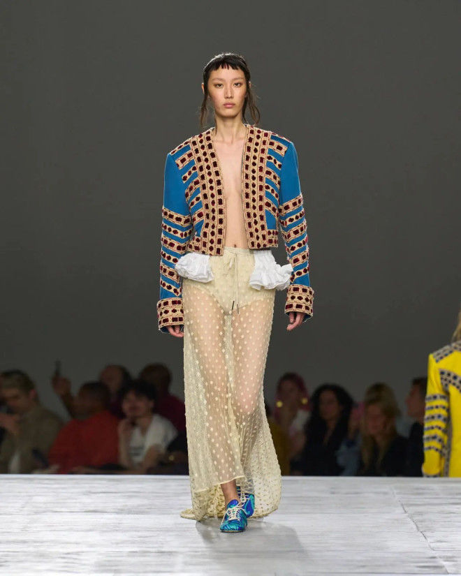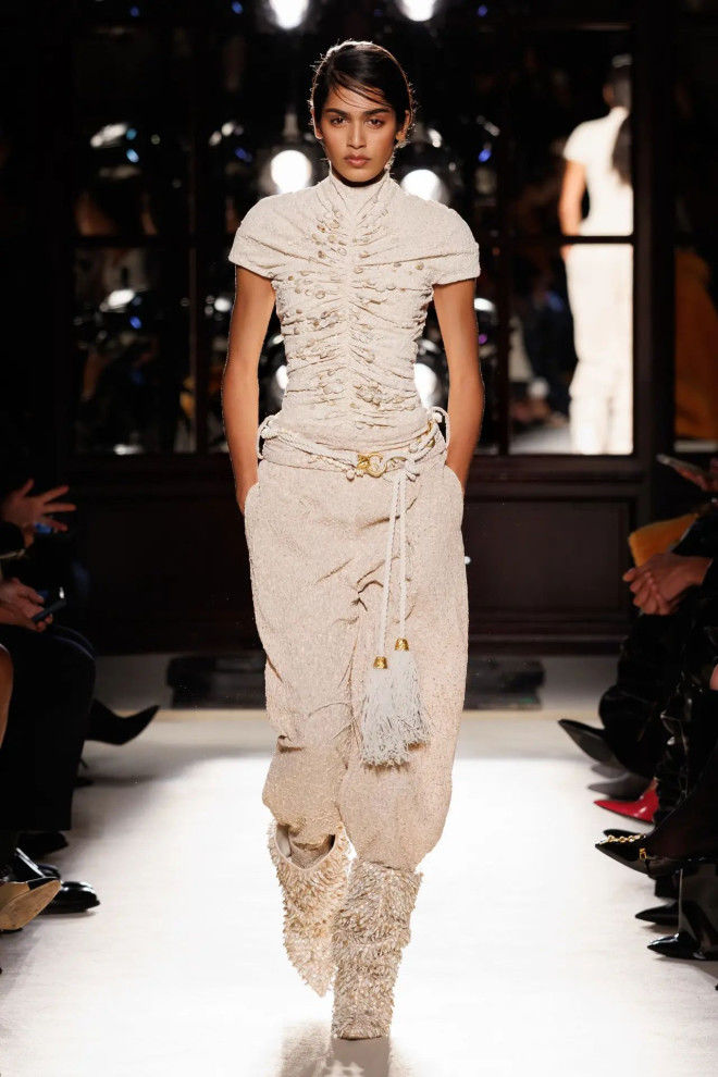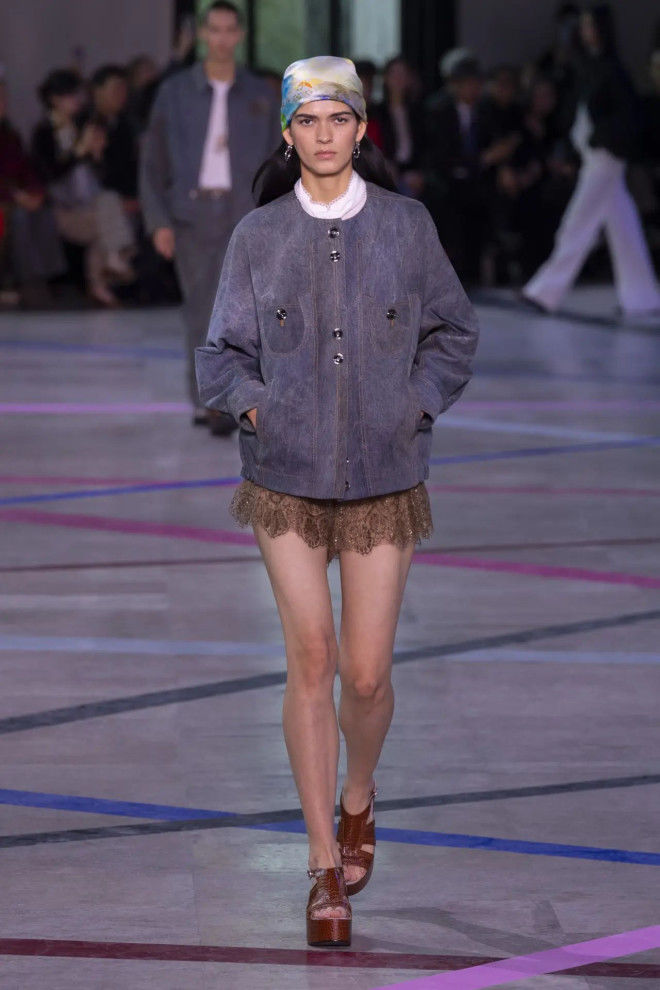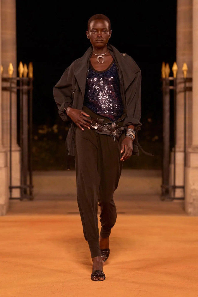 垂坠感连衣裙以绳结巧妙系带,若隐若现地勾勒肌肤。男女装皆以卷边短裤诠释率性,麂皮马甲下微露肩线,镂空孔眼与透空针织背心点缀其间。这套注重动态的手工制衣系列探索着自然色调的无限可能。沙色、米白、淡金、古铜渐次铺陈,刺绣繁花在蓝色丹宁上灼灼绽放。而后暮色四合,玄黑渐变为暮紫,最终融于星夜迷彩,夜幕笼罩巴黎皇家宫殿。