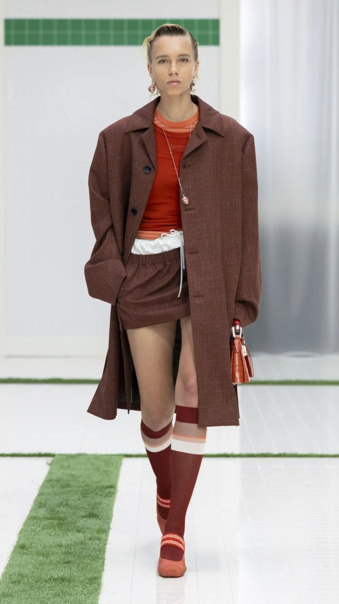 在 2026 春夏系列中,创意总监 Nicolas Di Felice 构想了一场追逐太阳升起的旅程,介于不可抗拒的吸引力与耀眼的清晰之间。五彩斑斓的廓形随着跃入耳中的逐渐攀升的温度不断递进,冰冷色调渐次转化为炽热通透的暖色肌理。随着温度的升高,源自品牌典藏档案的剪裁愈加流畅,Courrèges 的经典符号也随之柔化。
