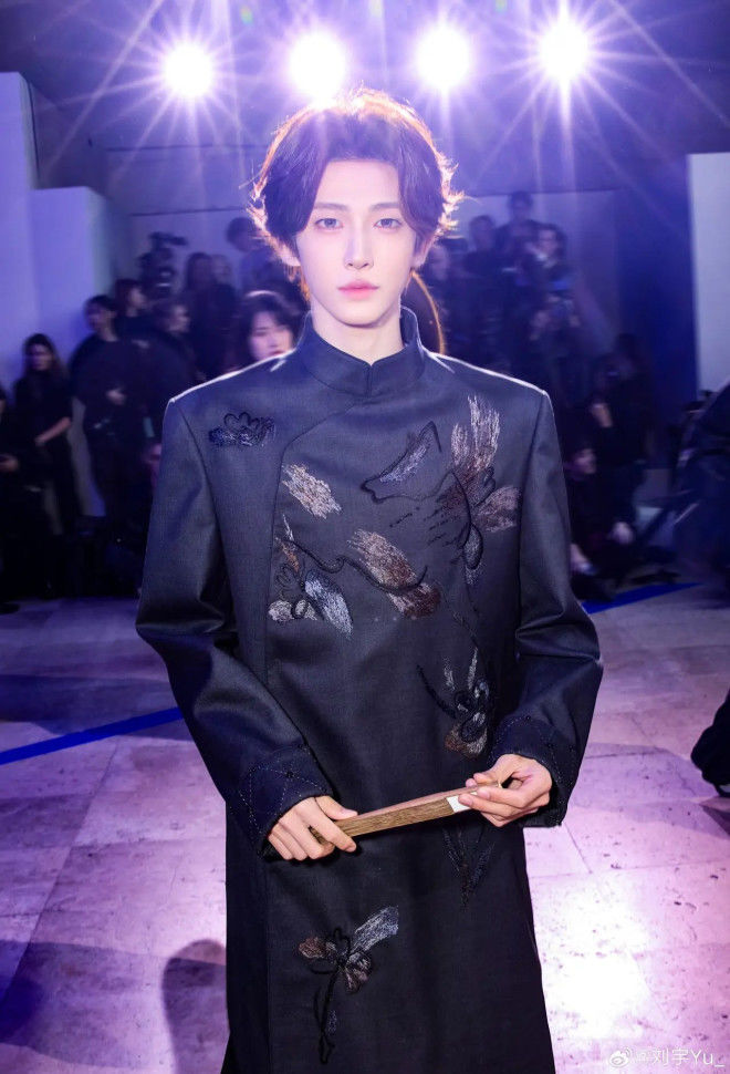 刘宇以一身中式礼服亮相秀场,深色调刺绣若隐若现,黑色儒雅,贵公子气质尽显。