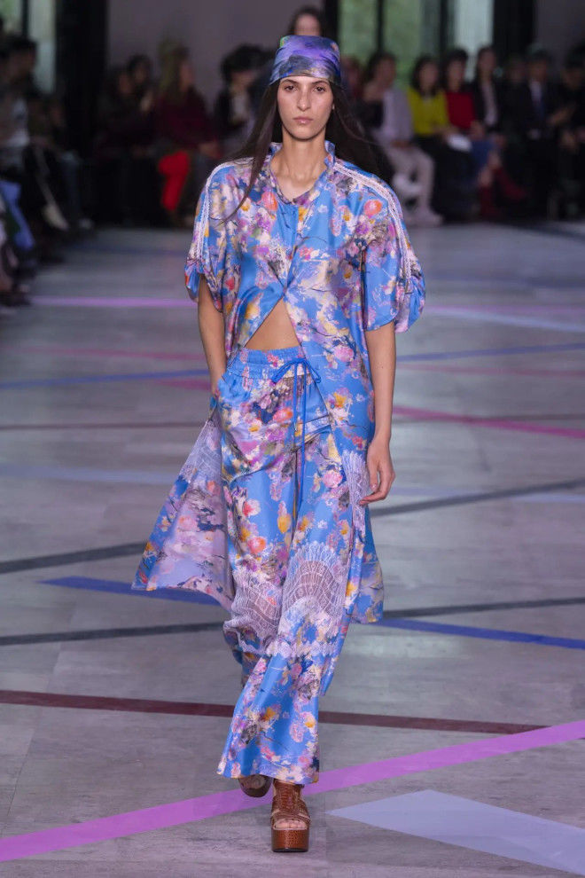 解密秀场,抽象结构化了波西米亚的奔放,非单一方向的光彩如即兴的舞步,绽放不羁与狂放,模特儿如马匹驰骋,仿佛闯入无疆之界;这片原野承载自由灵魂,也孕育东西方对马的想象——东方“马踏飞燕”凝聚速度灵动,西方羽翼骏马寄托力量梦想,一方含蓄深邃,一方直率明亮,交相辉映,铸就本季东方嬉皮的独有气息。