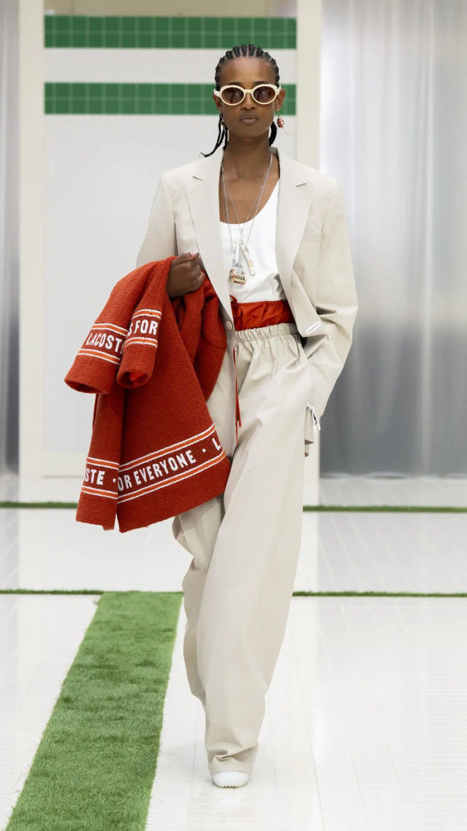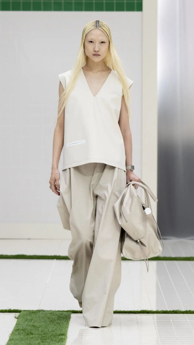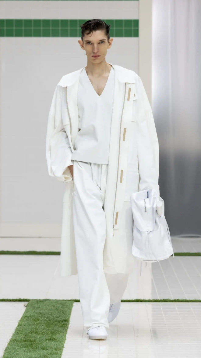 在巴黎 Lycée Carnot 埃菲尔大厅这一历史性地标,LACOSTE 将 2026 春夏巴黎时装秀的舞台重塑为“更衣室”。通过瓷砖铺陈的墙面重现了 René Lacoste 等所有运动员所熟悉的“后台”氛围:氤氲着水汽的弧形玻璃幕墙与层层垂落的淋浴帘幕。品牌创意总监 Pelagia Kolotouros 以全新时尚视角诠释品牌运动基因,超越竞技胜负的框架,聚焦于品牌创始人早年训练岁月中的纯粹初心。