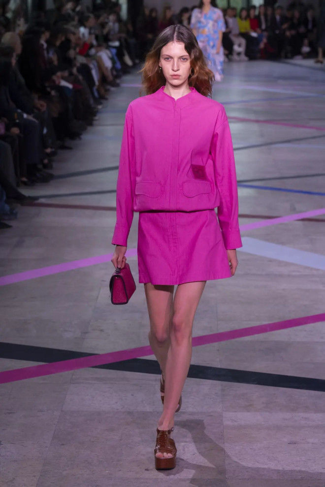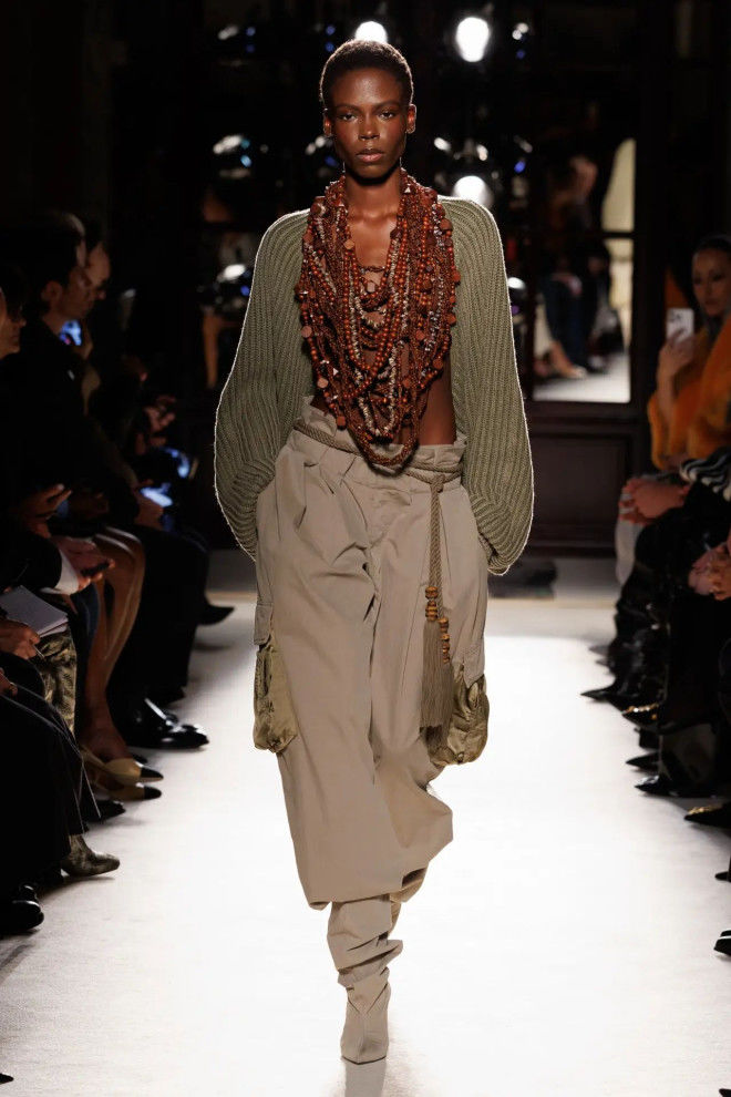 本季,她追随着阳光独自启程。系列作品烙印着旅途印记:水洗丝绸与针织面料,压花皮革被烈日烙下斑驳痕迹。图腾刺绣、串珠流苏、烙印树皮质感的珠宝,无不彰显对细节的执着追求。廓形流转自如:羽毛般轻盈的钩编织物,腰间随意系结的丝巾,在上衣与裙摆荡漾的不对称荷叶边。实用主义笔触勾勒出利落轮廓:工装长裤、搭配超大翻盖口袋的轻盈夹克、慵懒搭在肩上的托特包。