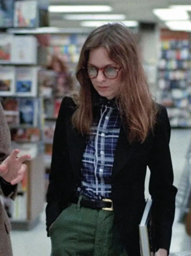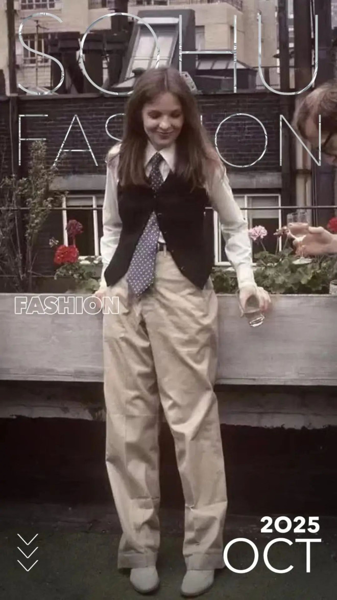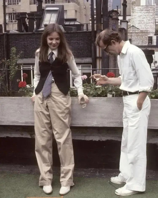 看过《安妮·霍尔》的人一定无法忘记黛安·基顿造型,她穿着男士白衬衫、黑色修身马甲、带褶皱的宽松卡其裤,还像男士一样系着一条蓝白波点领带。