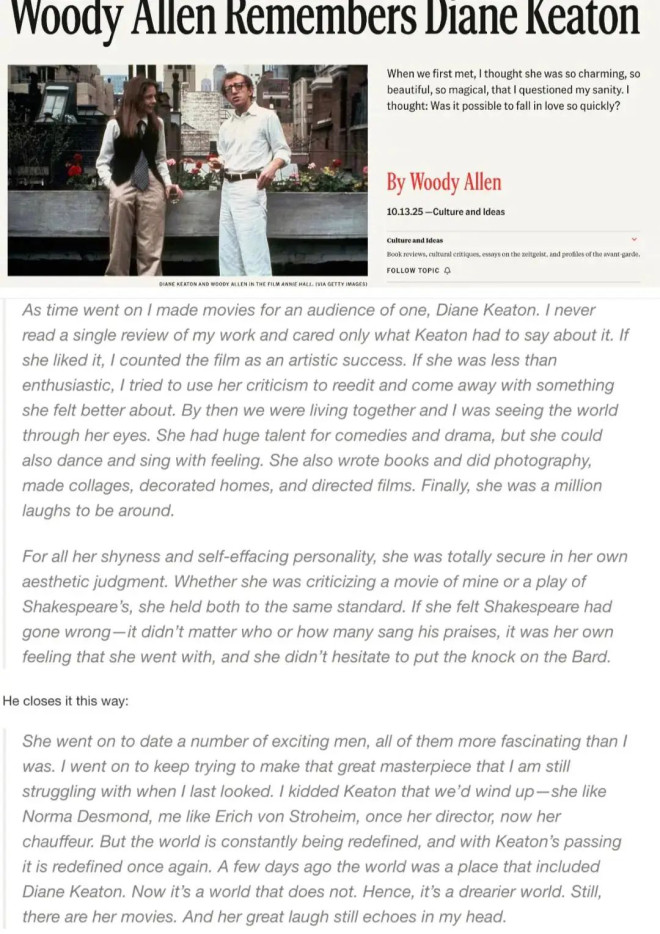 黛安去世后,伍迪·艾伦在报章发表悼念文章,文章第一句话就是“我拍电影只为了一位观众,就是她。”