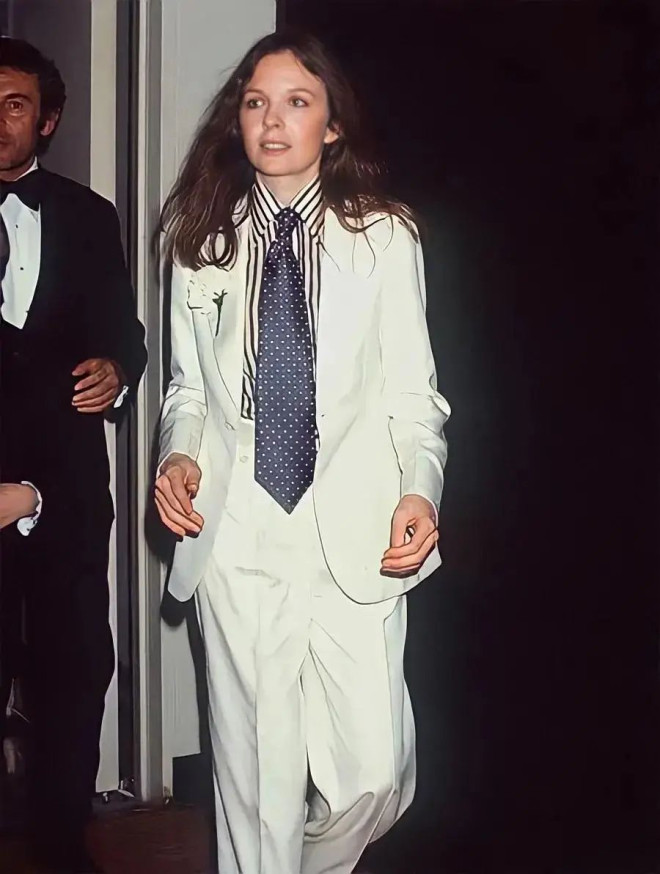 1976年第48界奥斯卡金像奖,黛安以一袭来自美国时装设计师理查德•泰勒(Richard Tyler)的珠光白西服套装亮相,内搭条纹衬衫,系上蓝色波点领带,条纹和波点的碰撞灵气十足, Gentlewomen的形象与文青气质相互交织。