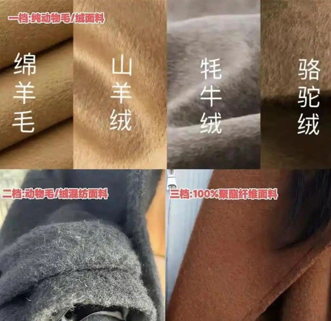 那么秋冬季节我们挑选大衣的时候,面料的种类还是比较丰富的,不仅有高档的还有低档的材质,我们可以根据上图选择合适的材质。比如像是羊毛、山羊绒这些都是优质的材质,穿在身上非常的舒适百搭,唯一就是价格稍微贵点。