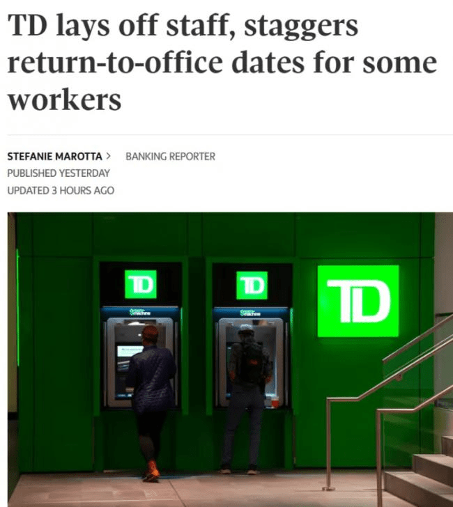作为加拿大第二大银行的多伦多道明银行(TD),近日确认将裁员约2%,并推迟原定于11月全面实施的“四天返岗”计划。消息人士透露,受影响的部门包括直接投资、风险管理及公司职能部门。TD在一份声明中解释,此举旨在“简化运营结构、提升效率”,同时继续投资人工智能、数字化与财富管理等战略领域。