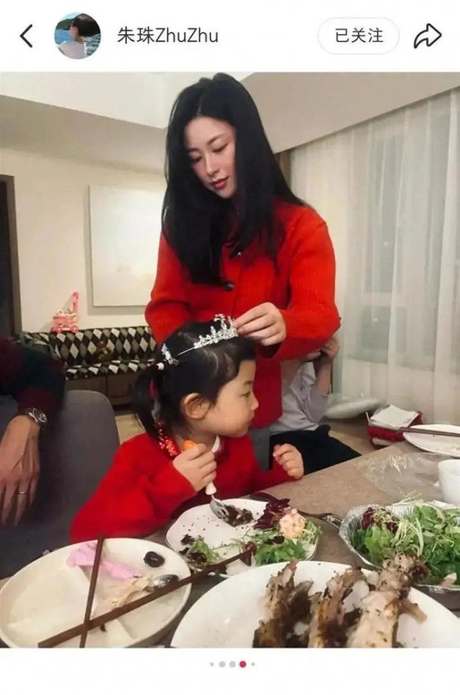 照片里她素着一张脸,穿件特普通的红色毛衣,和女儿穿着同款亲子装,一起装饰圣诞树。小姑娘头上戴着个亮闪闪的钻石小皇冠,晚饭后挺着圆滚滚的小肚子对着镜头臭美,那得意的小表情简直和朱珠小时候一模一样。