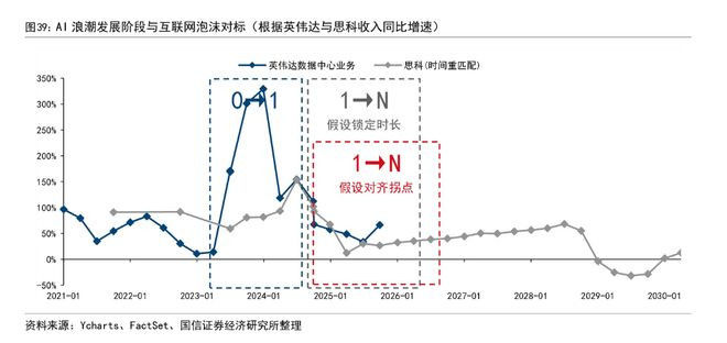 另一组对比来自专注于AI云计算的CoreWeave与当年的美国在线(AOL)。两者的营收增速对比同样显示,目前的AI产业处于应用拓展期。综合来看,这一阶段预计将持续至2026年年中。参考1998年的市场表现,“1→N”阶段通常以一次温和的市场回调结束,随后才会进入最为疯狂、泡沫化严重的“N→N+”阶段。