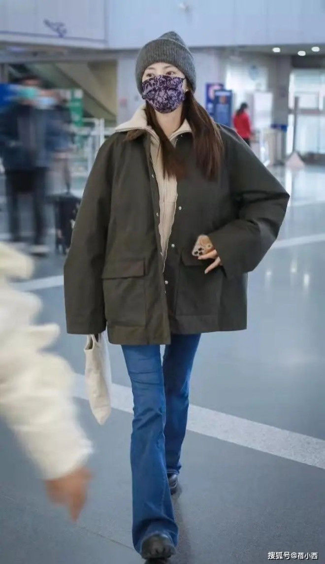 绿大衣在人群中是亮眼的存在,这件大衣长度在小腿肚处,比较挑身高,一米六以上的女生驾驭起来更容易些。里边是蓝色衬衫,它和大衣的门襟都是敞开的,进而让最里边的白内搭呈现出来,光是上半身,就至少有三个颜色。之所以如此说,是因为大衣之上还能看到黑色和浅棕色面料。腿上穿的牛仔裤刚好与衬衫颜色相呼应,这样一来,整体穿搭在颜色上就不会太多。