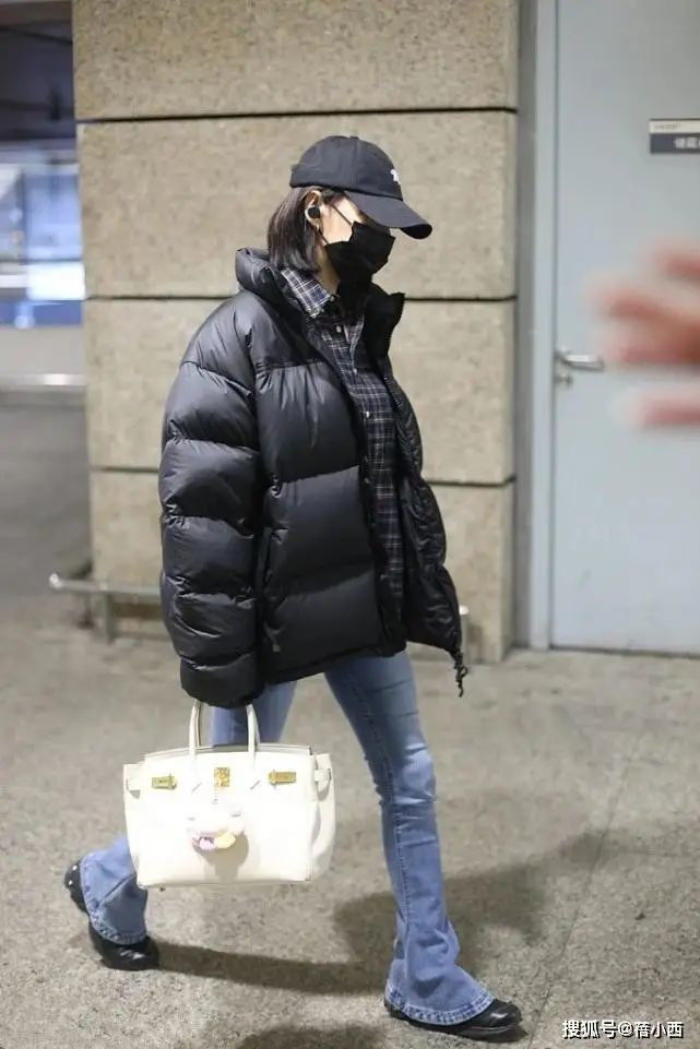 时髦精们穿羽绒服时,常常会选牛仔裤做下装,腿上裤子整体修身,脚踝往下松量能多些,因此,这条裤子适合腿细的姐妹。