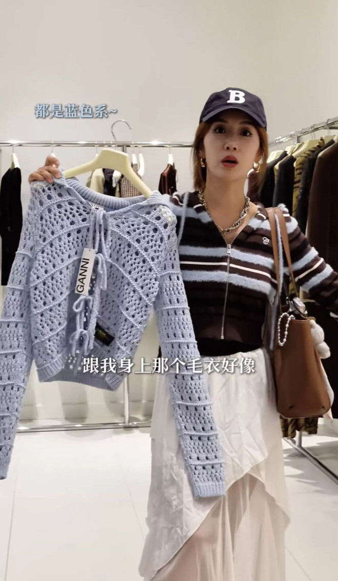 手里拿着的蓝色镂空针织衫,走的也是甜美风。李念都40岁了,衣着还这么少女,也足以看出生活的幸福。