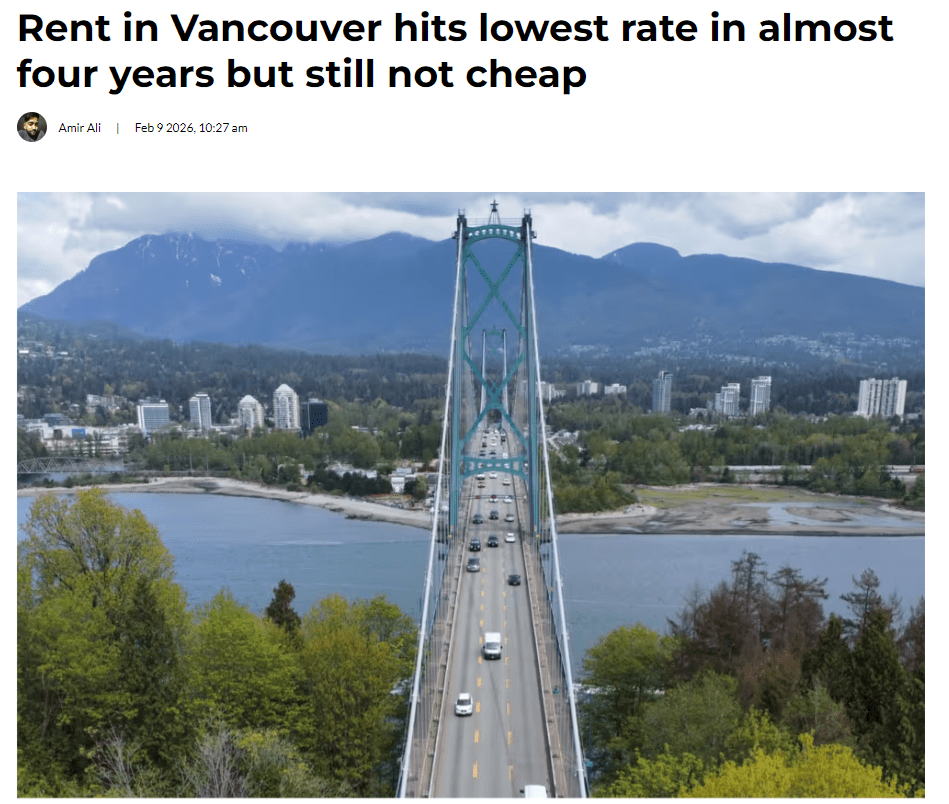 在加拿大房地产版图上,温哥华长期被视为“高不可攀”的象征。如今,数据正在发生变化——但体感却未必同步。最新租赁报告显示,温哥华公寓租金已连续26个月同比下跌,跌至近四年来最低水平。然而,对许多租客而言,这更像是一场“高位回调”,而非真正意义上的缓解。
