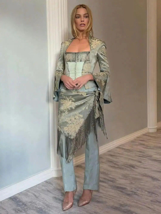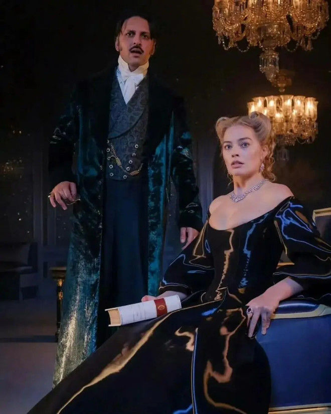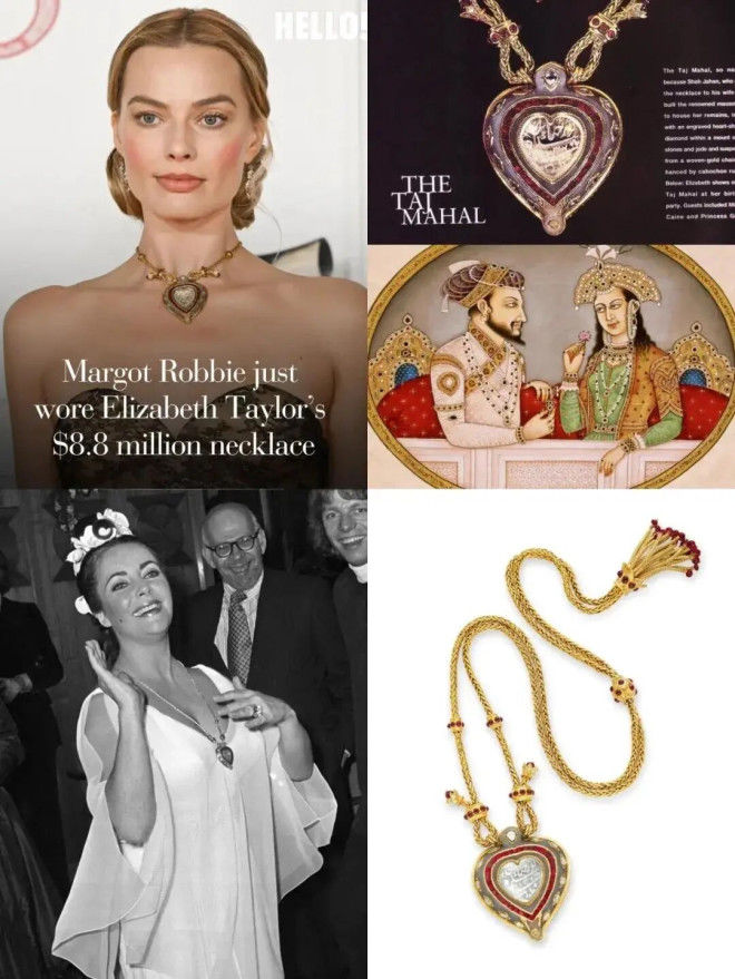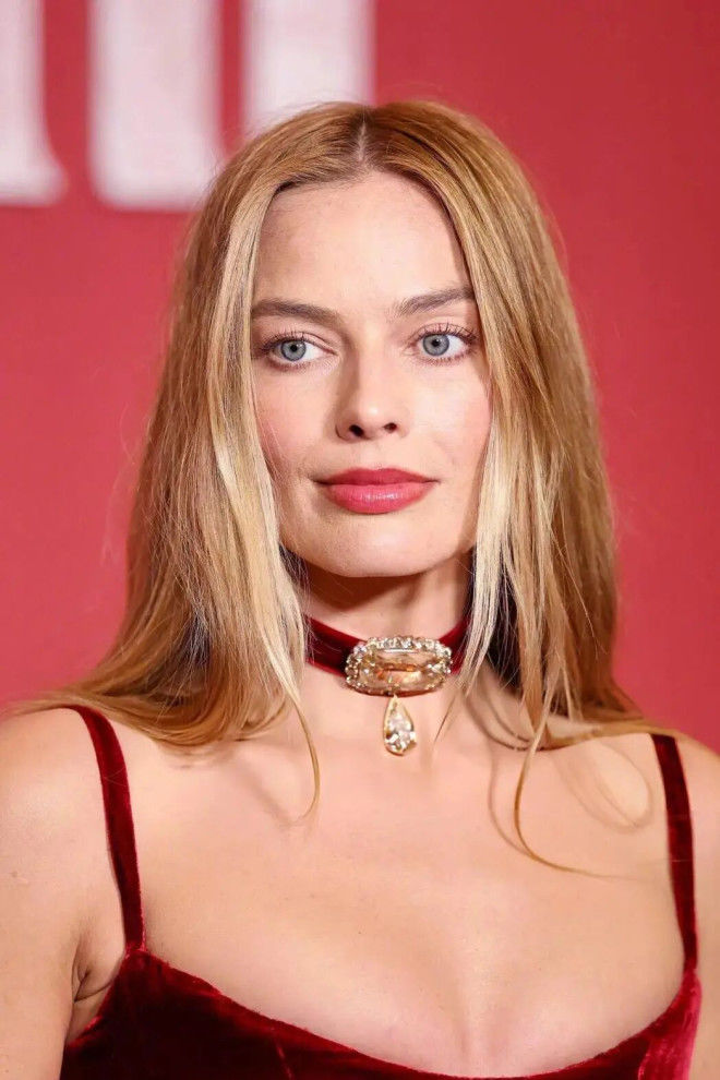 这身造型的另一个话题点是,Margot脖子上佩戴的那条伊丽莎白·泰勒珍藏的卡地亚泰姬陵钻石传奇颈链,价值约5000万人民币,这条项链是理查德·伯顿送给泰勒的40岁生日礼物,象征”永恒之爱”,与影片虐恋主题呼应。