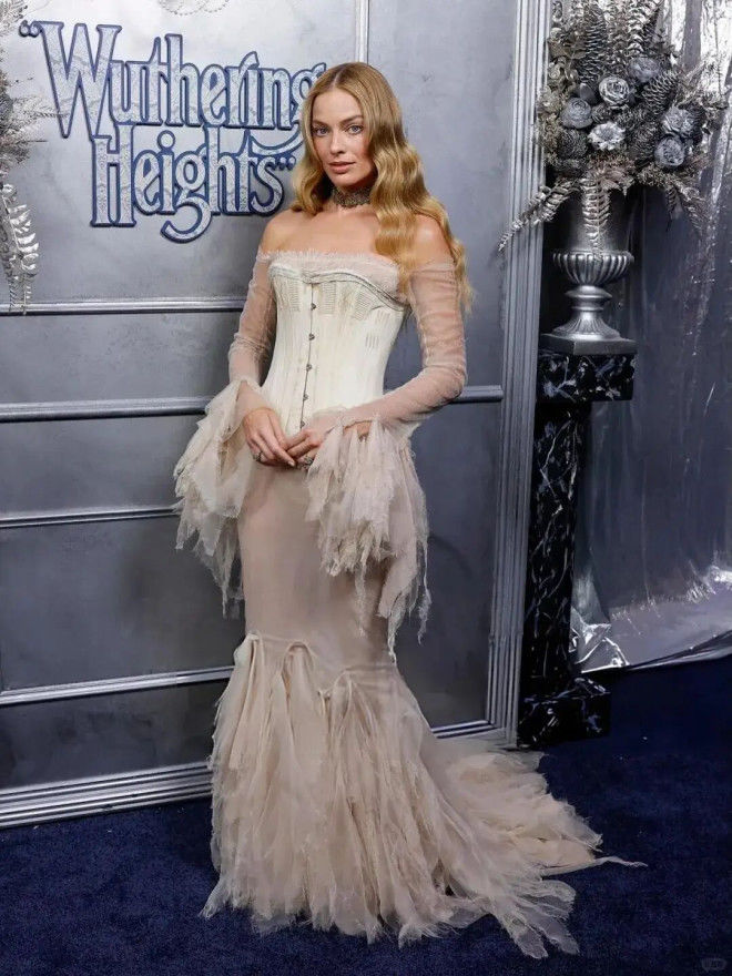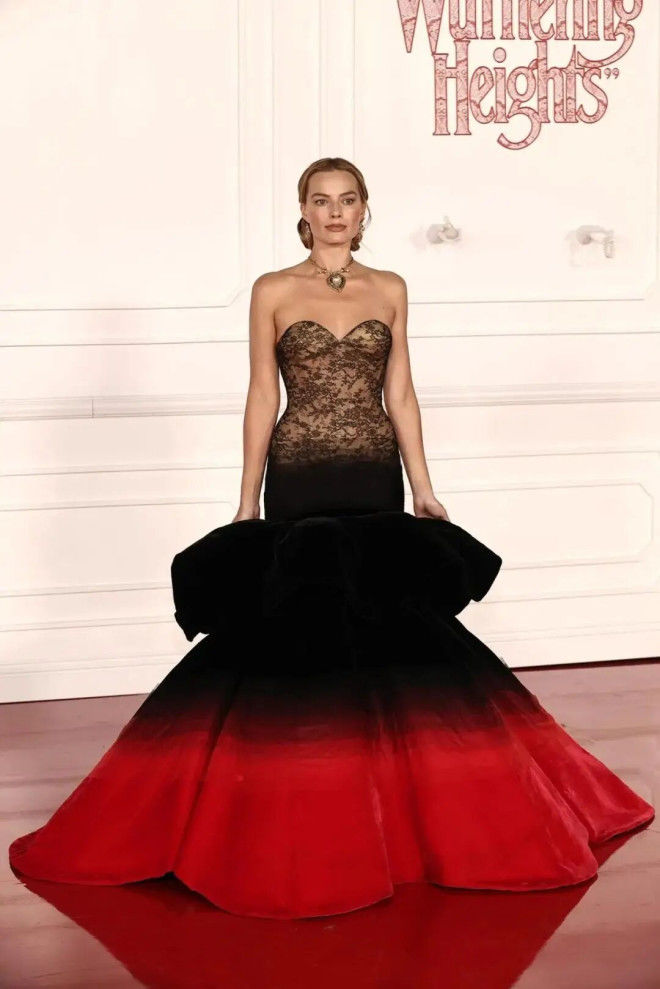 1月29日,出席洛杉矶全球首映期间,Margot Robbie 身穿 Schiaparelli 定制礼服,礼服灵感来自当时发布仅三天的Schiaparelli 2026春夏高定系列,手工刺绣蕾丝紧身衣搭配红黑渐变层叠鱼尾裙摆,宛如”行走的火焰”,与原著“浪漫、激情、戏剧化”主题相得益彰。