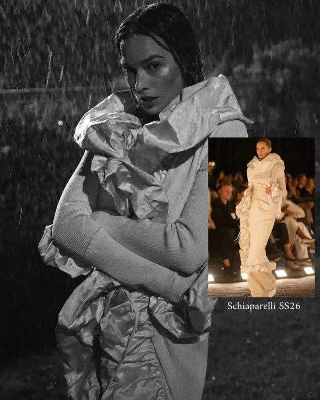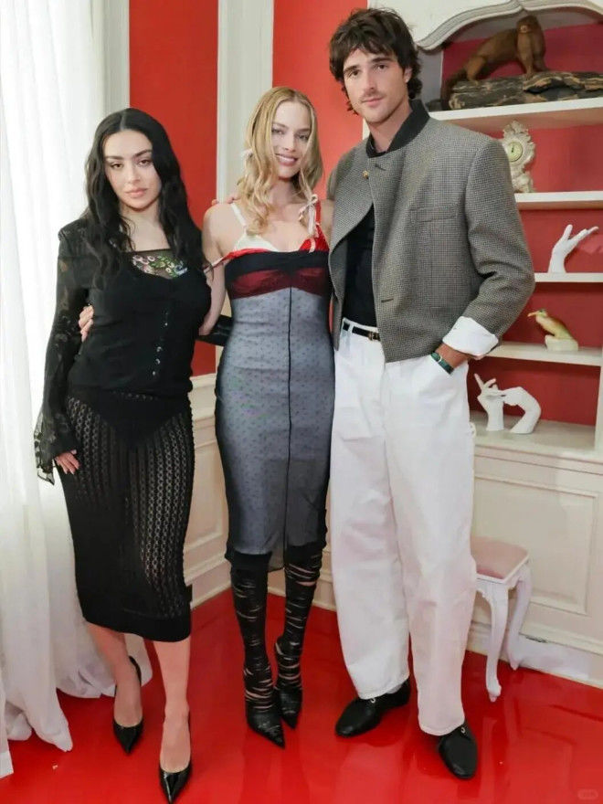 Margot Robbie的宣传造型中还出现了中国设计师的作品,这套黑色网纱抹胸裙、粉色碎花抹胸连衣裙和及膝绑带高跟鞋均来自MARKGONG 2026春夏系列,这是中国设计师龚子铭(Mark Gong)2018年创立的同名品牌,破碎感和性张力十足。