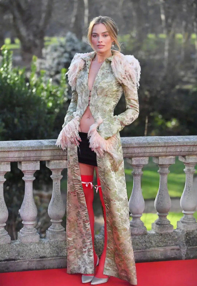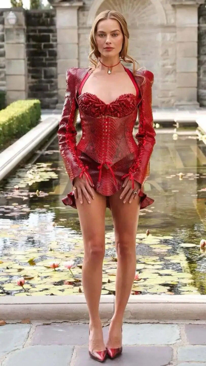 洛杉矶出席电影新版《呼啸山庄》媒体见面会时,Margot Robbie身穿Dilara Findikoglu 2025秋冬系列红色胸衣款紧身皮革短裙,蛇皮元素破碎感十足。