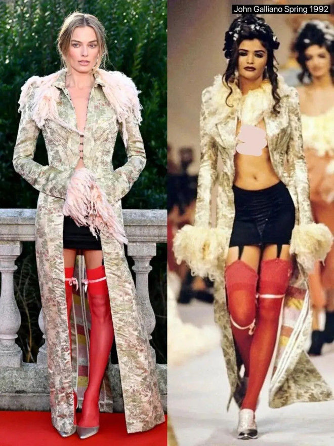 出席伦敦斯宾塞庄园媒体活动时,她身穿John Galliano 1992春夏系列鼠尾草绿刺绣长外套,搭配亮红色丝袜,形成强烈对撞,传奇设计师的典藏被她完美激活。
