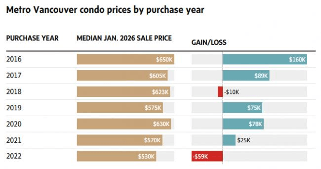 数据揭示,这并非个案。根据HouseSigma2025年1月统计,2020年购入并近期出售的多伦多公寓中位亏损约1.87万加元;2021年买家平均亏损5.6万;而2022年入市者平均亏损高达11.6万加元,约占房价19%。在大温地区,类似趋势同样出现,部分高峰期买家转售亏损超过7%。