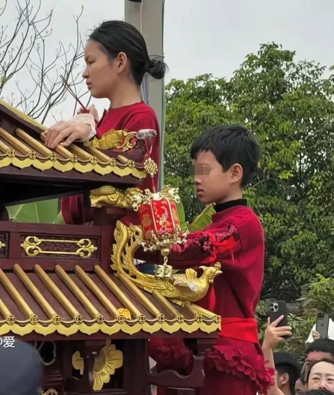 而换人小男孩在轿子上也一直无法静心,左顾右盼,站姿也不如女孩端庄稳重,似乎并不知道自己的行为代表着什么,也不知道周遭发生了什么。