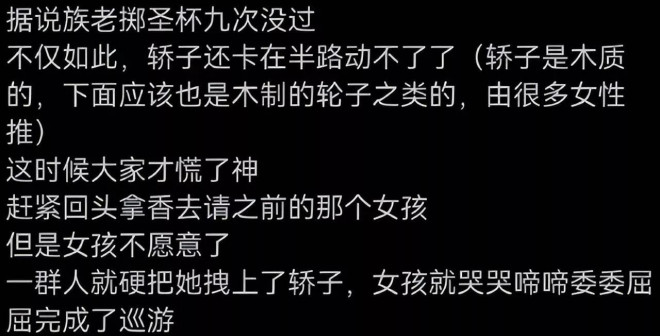 对比之下,换人男孩的程序出现了问题。网传换人女孩走传统流程获得了妈祖同意,结果当地主办方想要塞自家男孩入场,未尊重传统民俗筛选的结果,掷杯8次都没有通过,第9次有“大凶”之相,导致抬轿人慌神不敢抬轿,最终又把女孩生拉硬拽扯上轿子。
