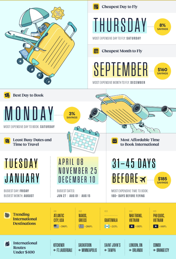报告显示,过去被视为经济舱“最便宜日”的星期二,如今已经被星期四取代。数据显示,选择在星期四飞行而非周末高峰日,如星期六,可节省约8%的机票费用。原因在于,商务旅客大多在周末前返回,导致周中航班需求下降,为休闲旅行者提供了价格优势。同时,1月份是国内航班最便宜的月份,而9月的国际航班价格平均比12月低26%,折合每张机票节省约160加元。