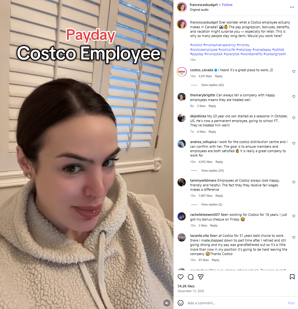 根据公开信息与员工分享,多数新员工以兼职或季节性岗位入职,起薪约为每小时20至22加元。真正改变收入轨迹的,是其相对制度化的薪资晋升机制:员工累计约1,040小时工作时数即可自动提升薪级。随着资历增长,部分岗位时薪最高可超过33加元,叠加周日补贴与年度奖金,成熟员工的年收入可接近或超过7万加元。