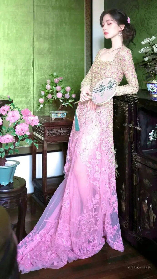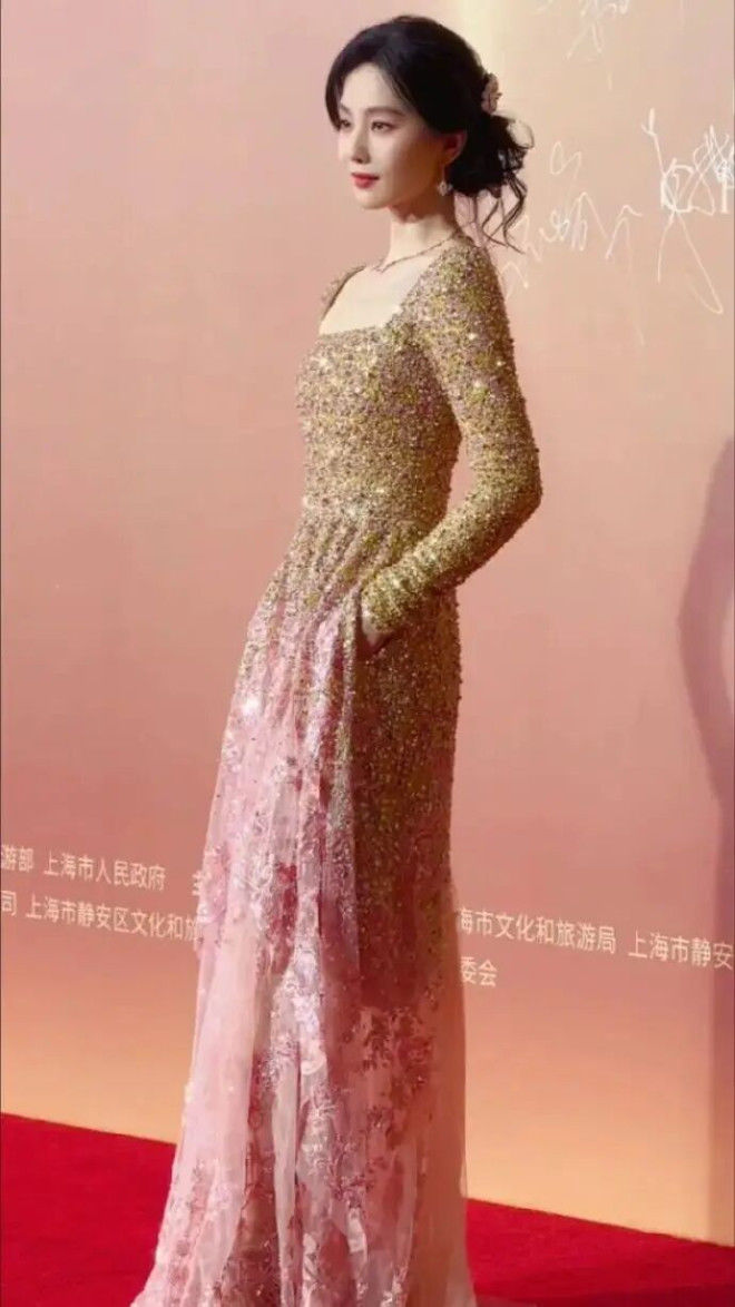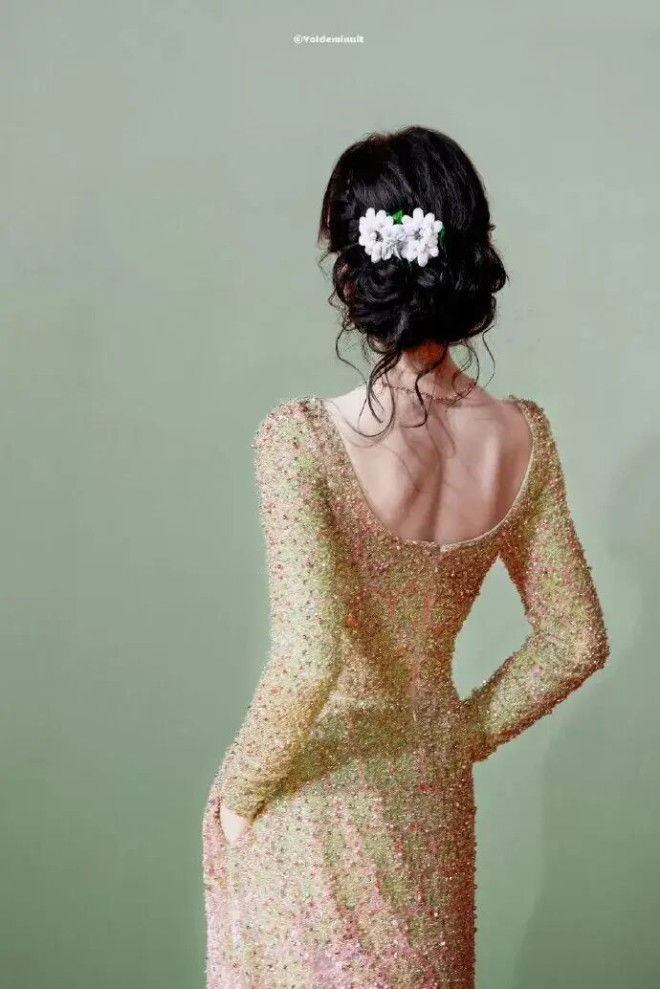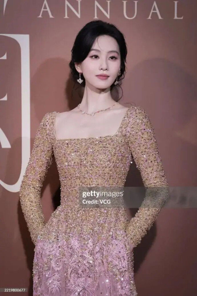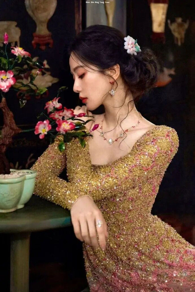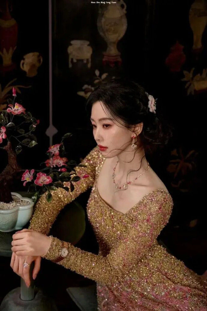 刘诗诗的的衣裙将传统工艺与时尚美学融合的尝试,她拿着古典小扇子,既展现了东方雅韵,也推动了南京绒花技艺的现代传播。