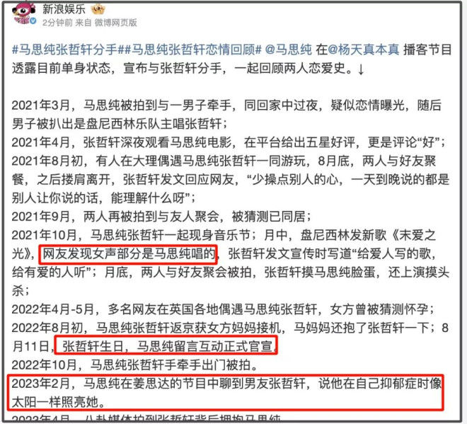 后来有粉丝爆料两人已经分手了,在马思纯重新出来拍戏的时候,就已经和张哲轩分手了,被狗仔拍到一起吃饭是被做局了。