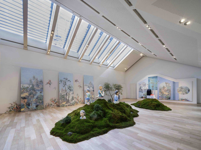 在本季主题橱窗暨同名展览《乌有园》中,这一创作体系得以进一步推演:上海“ 爱马仕之家”入口处,岛屿浮现,苔色蔓生,引观者移步入画。橱窗陈列依卷轴徐徐展开,山水在展览中由象入境,化作穿越古今的园林。艺术家以蒙太奇式的手法造境,实现平面与立体、自然与城市、神圣与世俗、想象与现实的自由连接,于百年建筑内开辟精神花园。