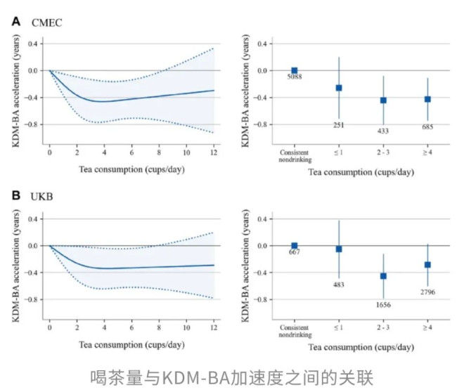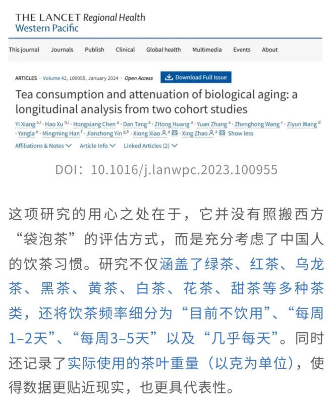 既往研究表明,茶多酚具有抗炎、抗衰老、调节表观遗传等多重功效,可谓养生界的“顶流”。四川大学华西公共卫生学院团队一项发表于《柳叶刀》子刊Lancet Regional Health – Western Pacific的研究[3]为茶中的抗衰秘密提供了更具体的数据支持:每天喝大约3杯茶(或相当于6–8克茶叶)的人,抗衰老效果最为显著。