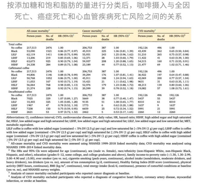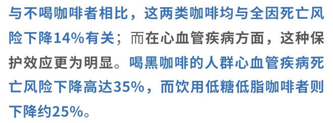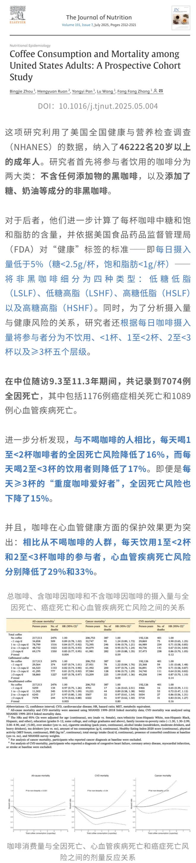 事实上,单拎出咖啡或茶来,也是很能“打”的存在。一项发表于The Journal of Nutrition的研究[2]表明,饮用咖啡与全因死亡和心血管疾病死亡风险降低显著相关,但这种好处并非“加料不限量”。只有黑咖啡或仅添加少量糖和饱和脂肪的咖啡才能带来健康收益,一旦加糖或加脂过多,这种保护效应便会消失。