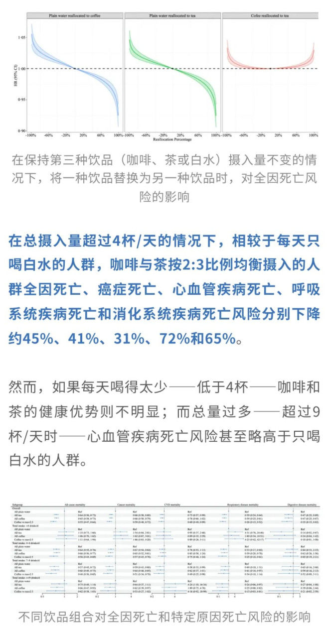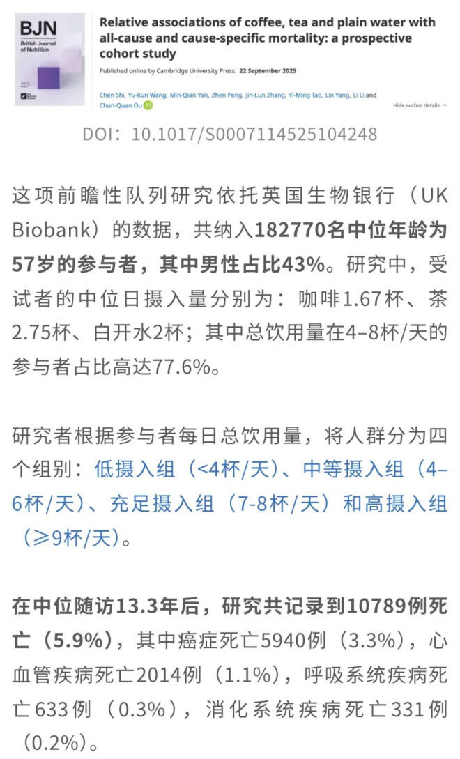 的秘诀真的只是“多喝热水”? 近期发表在British Journal of Nutrition的一项研究[1]给出了令人意外的答案:每天摄入约7–8杯咖啡、茶和白开水的组合,与最低的死亡风险相关。当总饮用量超过4杯时,若用咖啡或茶部分替代白水(尤其保持咖啡与茶约2:3的比例),还能进一步降低全因死亡、癌症、心血管、呼吸和消化系统疾病的风险。(一标准杯为8盎司,约240mL)