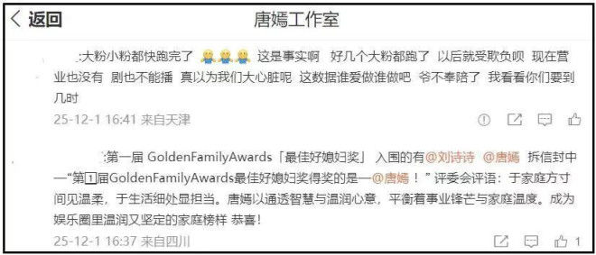 因为12月没有具体行程,唐嫣工作室的评论区都沦陷了,放眼望去都是质疑之声,大批粉丝表示要脱粉。