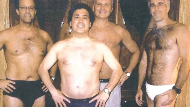 图片的右边,爱泼斯坦在一群几乎全裸的女性为他按摩时面带微笑。天上还有他把少女和贵宾们运到“恶魔岛”的私人班机。