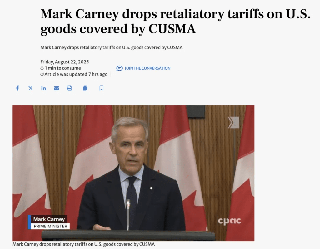 当地时间8月22日,卡尼政府宣布将取消针对绝大多数美国产品征收的报复性关税,理由是“缓和紧张局势,稳定双边经济关系”,并为启动《加美墨协议》(CUSMA)后续谈判创造条件。